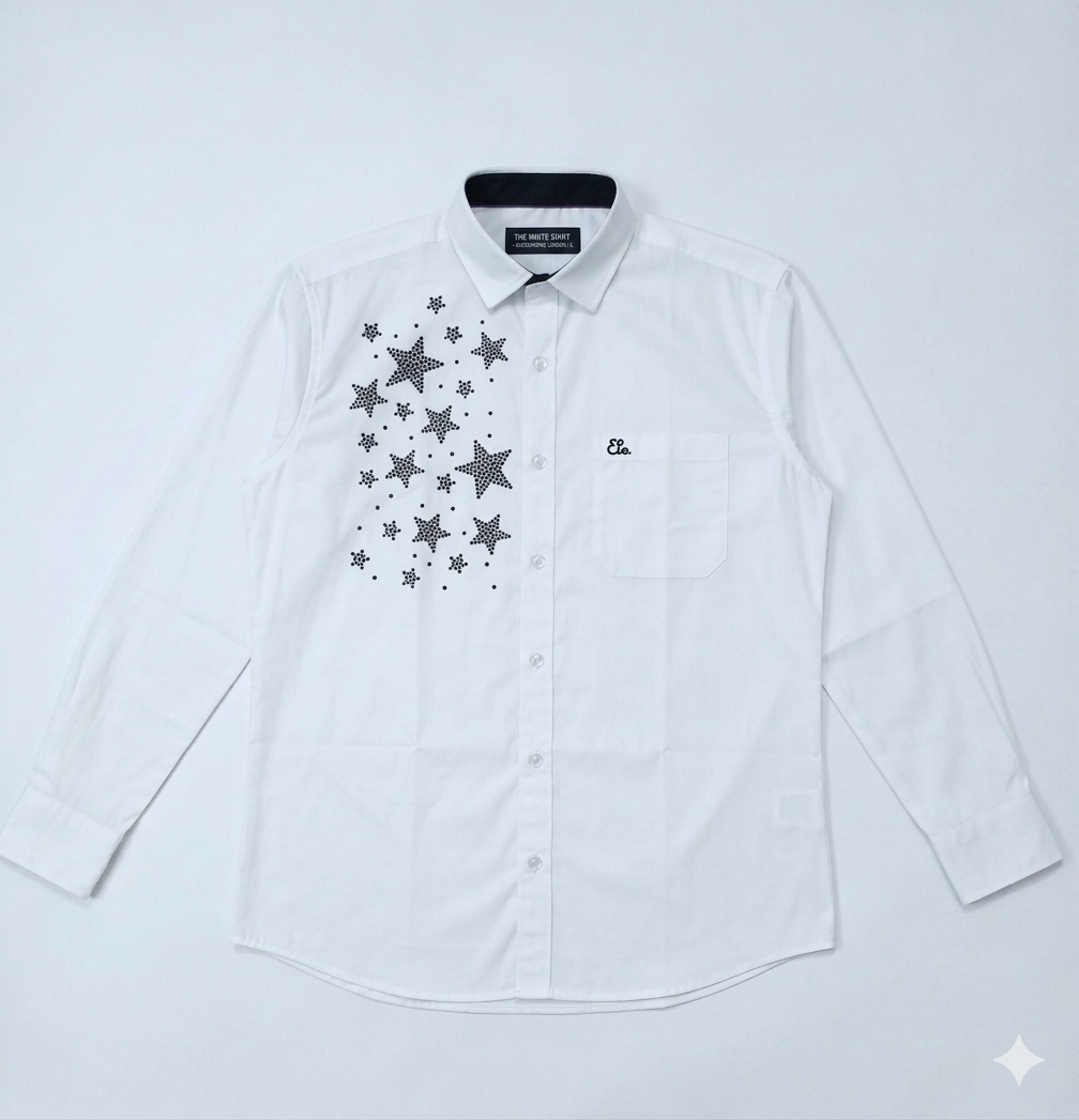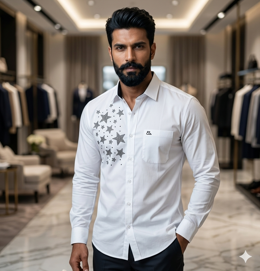 To be fair, a white shirt is a wardrobe basic, but this specific design is anything but ordinary. It features an intricate, hand-finished Black Crystal Stone Work in an asymmetrical star-burst pattern on the right chest. These aren’t machine-stamped glitters; each micro-crystal is carefully set by our artisans to catch the light exactly when you move, creating a subtle shimmer that screams ”
