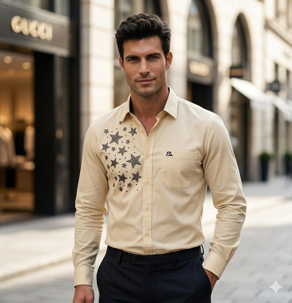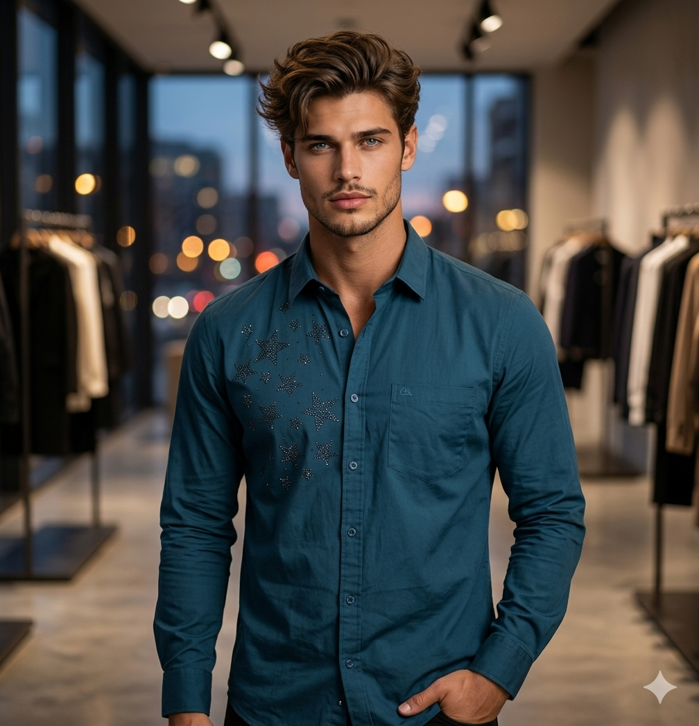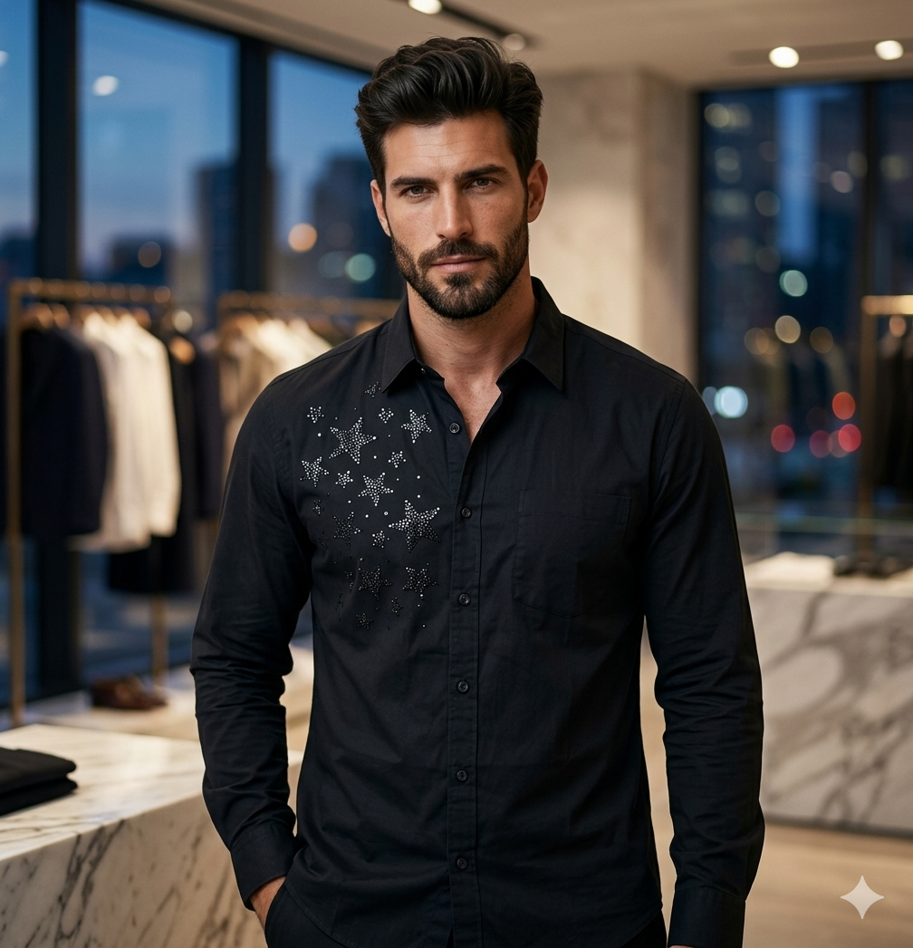 This isn’t just about the “bling”—it’s about “Soft Power Dressing,” a 2026 trend where your style speaks before you do. Whether you’re looking for a sharp outfit for a wedding sangeet or a high-end rooftop dinner, this geometric crystal layout adds a 3D visual depth that simple printed shirts for men simply cannot replicate.